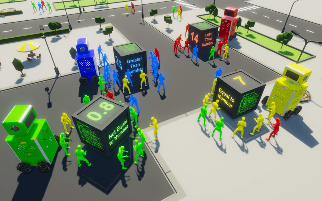Below is a screenshot taken from inside of the virtual reality environment the physical robots learn from. Let’s breakdown the scene to give a better understanding of what this project is and what has been accomplished. The first thing to notice is that there are color coded actors in humanoid forms, and then a lesser number of larger robotic actors, also color coded. These colors represent teams working together to solve problems. The problems they are solving are shown on the problem/terminal/answer cubes. These cubes provide a problem statement, an answer (which is also the points scored for solving the issue) and 4 python terminals the humanoid actors can access and use. Yes, you heard correctly, there are computer terminals here that allow python programming. Basically, the terminals are like little computers the actors can use, and this is how they try to solve the problem statements. If the output of their python program matches the problem statement number then they are awarded that number of points to their team.